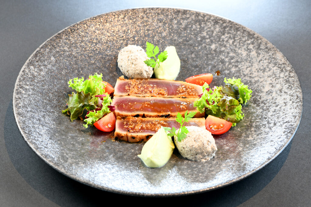 鮪のグリエ タプナードムースとブロッコリムース添え