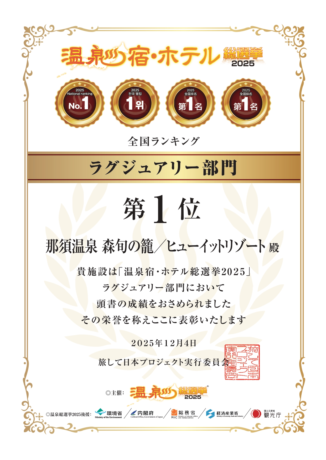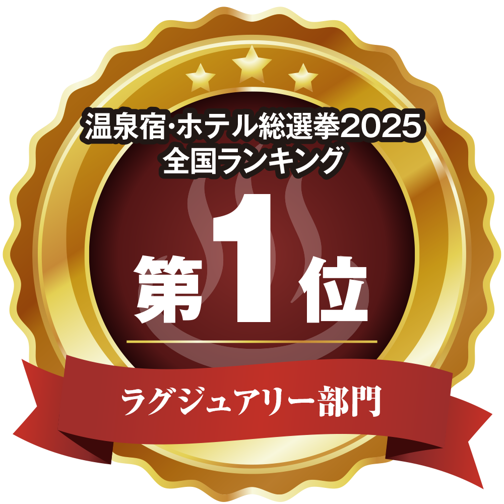 このたび当館は、温泉宿・ホテル総選挙2025において「ラグジュアリー部門」全国第1位 を受賞いたしました。日頃よりご宿泊いただくお客様をはじめ、投票や温かいご声援をお寄せくださった皆様のお力添えの賜物であり心より厚く御礼申し上げます。今後とも上質で心に残る滞在体験をお届けできるよう励んでまいります。引き続き変わらぬご愛顧を賜りますようお願い申し上げます。